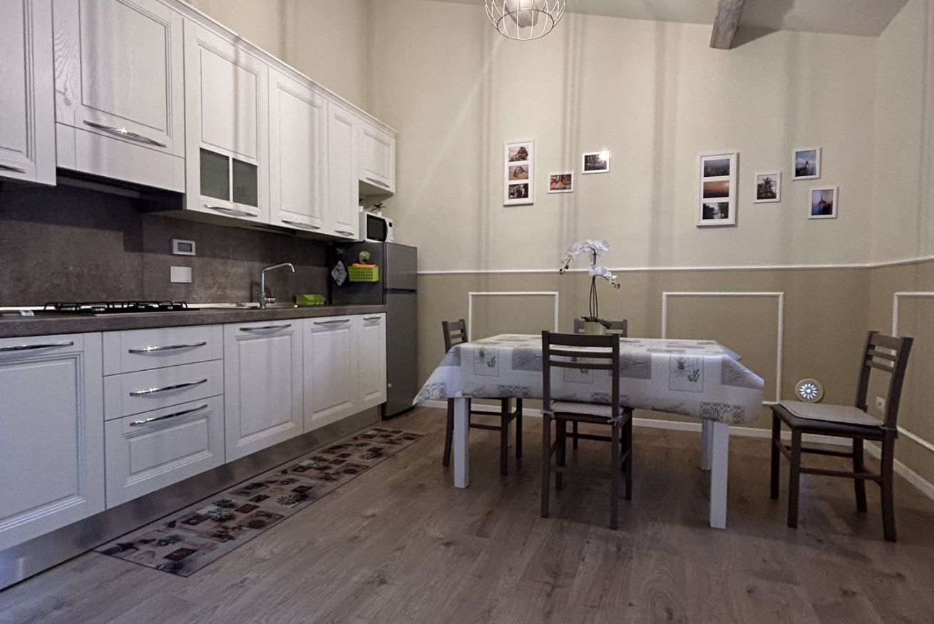 Moving forward in the corridor we would find ourselves in the living room area with kitchenette, where we find a kitchen fully equipped with everything needed to prepare a meal during your stay (instead of the traditional oven we have placed a microwave which also has the grill function) .